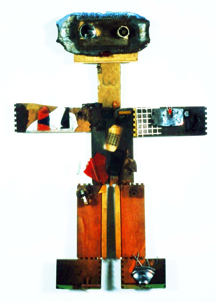 I started creating ‘paintings’ using paints and collage in 1973. Participated in my first art exhibition in 1976, a group exhibition at the short lived “Peace Gallery’ located on the east side of Ottawa Street a few doors south of Cannon. In 1979 I felt I had enough work to approach the Hamilton Artists Inc. (which I had recently joined) about a solo show. By then I was using found materials along with paints and collage in my work. I was given an exhibition in the summer of 1981. The administrator of HAI at the time, Gordon T. White, selected the pieces to be shown ;in the exhibition. I was off and running.