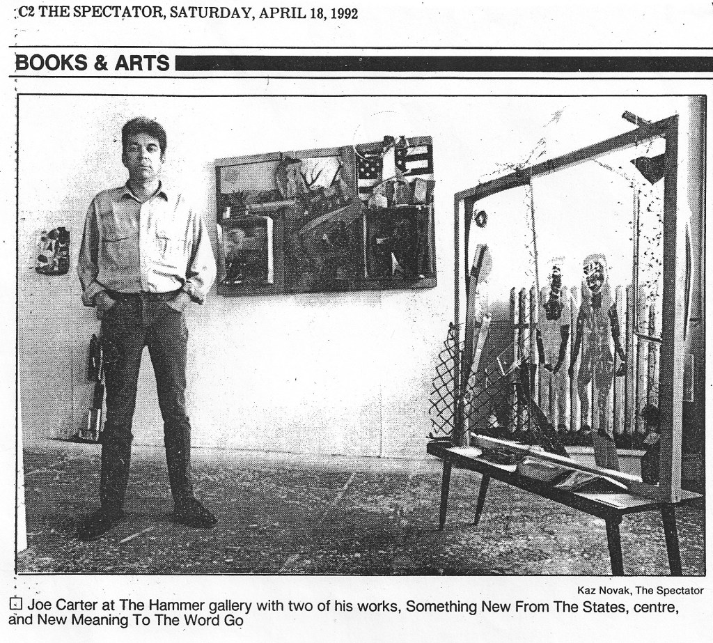 In 1992 Jim Mullin & Denise Lisson offered me a solo exhibition at their Hammer Gallery. This was my first opportunity to showcase my constructions since the Hamilton Artists Inc. in 1980 although I’d had a solo exhibition of my woodcuts at the Carnegie Gallery in 1988. During that time I had been in number of group exhibits and had built a body of work, this was a great opportunity. The show was well attended making it an extra great opening. The Hamilton Spectator’s Paul Benedetti wrote a fine article titled “This Art Is Garbage” the only downside being he called me Joe Carter. The Toronto Blue Jays were hot that year led by said Joe Carter and headed for the World Series, I guess Paul was a huge baseball fan. As I always say “anything is better than nought”.