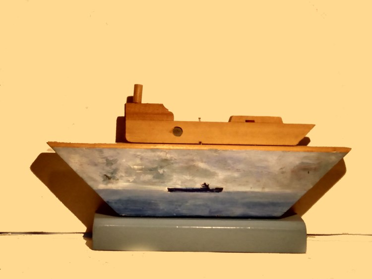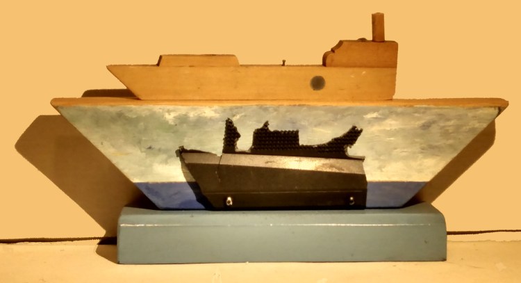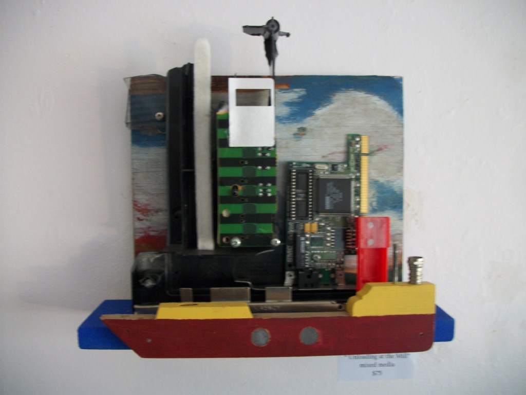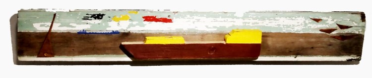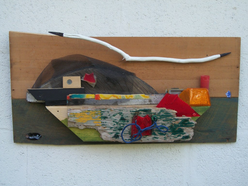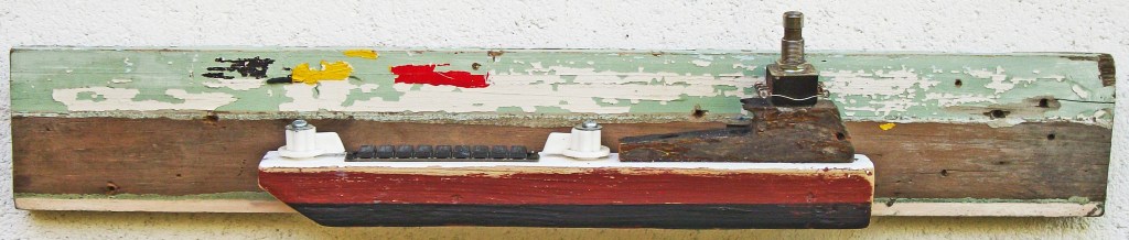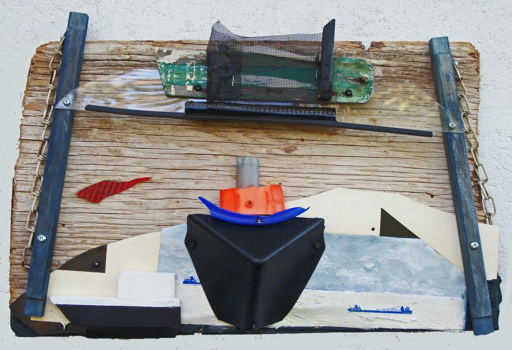 The visual impact of moving to Port Colborne from Dundas, Ontario in 2007, a block from the Welland Canal’s Lock 8 and it’s constant parade of ‘boats’ travelling up and down between Lake Erie and Lake Ontario. And the close proximity to Gravelly Bay with it’s marina and the grain elevators and flour mill provides one with a kaleidoscope of visual impressions and creative ideas. Overhead at times there is lots of air traffic, both American fighter jets patrolling the border, air traffic in and out of Buffalo, local Air Rescue as needed and tourist flights over the Niagara Region. As I got to know Port Colborne and surrounding environs I realised that what was stimulation for me as a visual artist (the Welland Canal, the lake and the boats) for many decades has been and continues to be a major stimulus for creativity for many in the local visual arts community using traditional techniques: paintings done with oils, watercolours or acrylics, relief prints and drawings. I decided instead of working in those popular techniques to interpret what I was ‘seeing’ through “Constructions” of found materials, beach debris and paint.