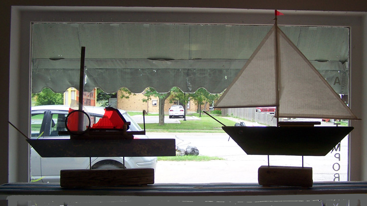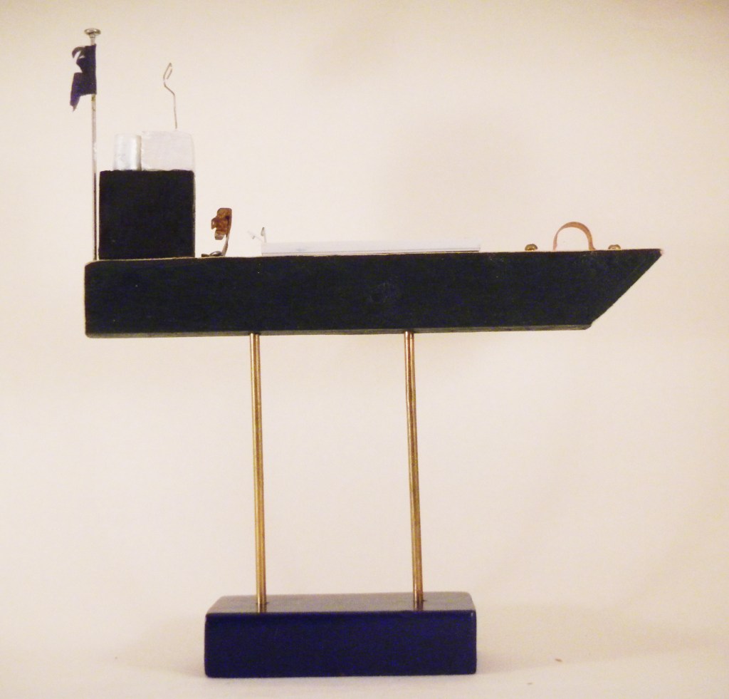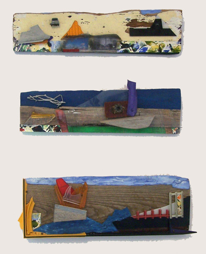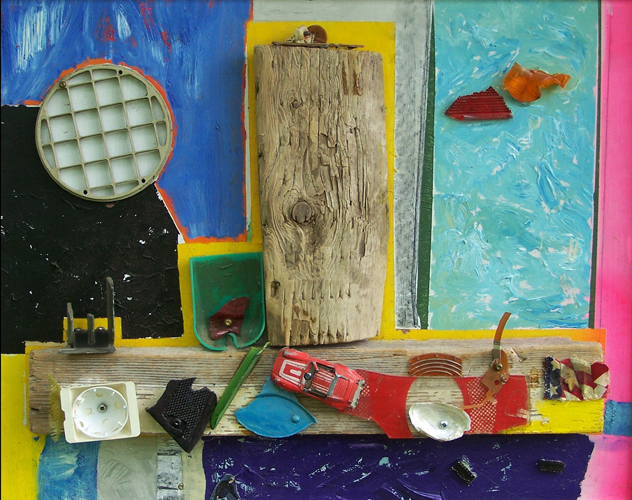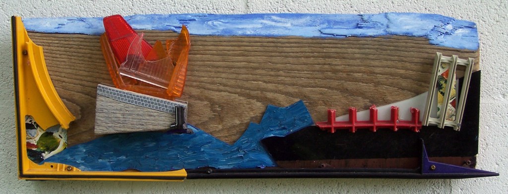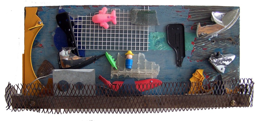 The visual impact of living in Port Colborne since 2007, a block from Lock 8 and it’s constant parade of ‘boats’ as well as the close proximity to the harbour, Gravelly Bay, and Lake Erie, provides one with a kaleidoscope of visual impressions and creative ideas. As I got to know Port Colborne and surrounding environs I realized that what was stimulation for me as a visual artist (the Welland Canal, the lake and the boats etc.) has been and continues to be, a major stimulus for creativity to the entire local arts community. For this project at Arts Place Gallery, Port Colborne, ON, I decided to interpret what I was ‘seeing’ through found materials, beach debris & paint. Welcome to “The Boat Show”.